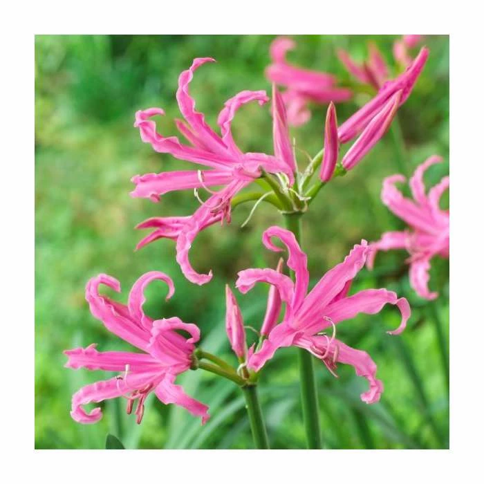 Nerine bowdenii ‘Favourite’ produces bright pink star-shaped blossoms which unfurl atop their slender green stems. This beautiful composition makes this perennial perfect for making cut flowers, where they will look lovely in mixed bouquets.