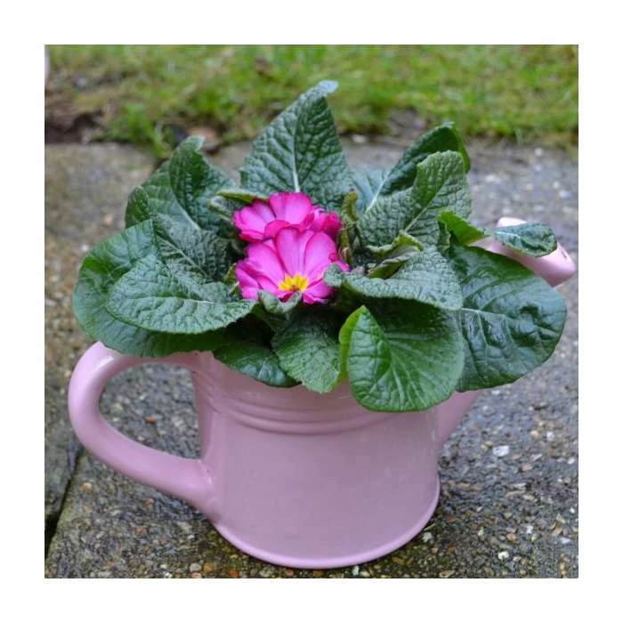 Carefully put together by our trusted nursery, this ceramic watering can planter has been filled with a Primula ‘Woodland Rose’, which will keep your garden beautiful and lively right until spring. The pale pink shade of this planter will add an idyllic, charming touch to a windowsills or a porch, and really harmonises with the darker pink colour of the Primula.