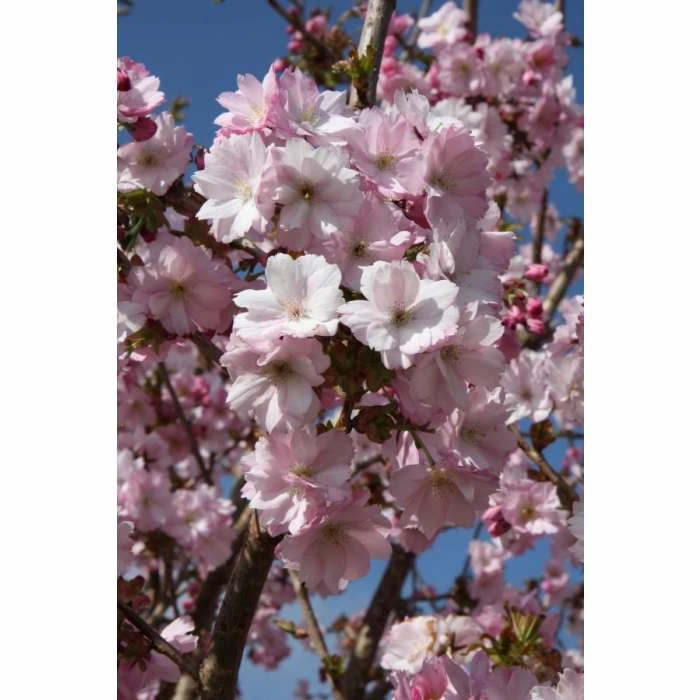 A semi-double, disc-shaped flower in a unique sugar pink colour with a distinctive dark central eye, developing as the flower ages, in early April.
